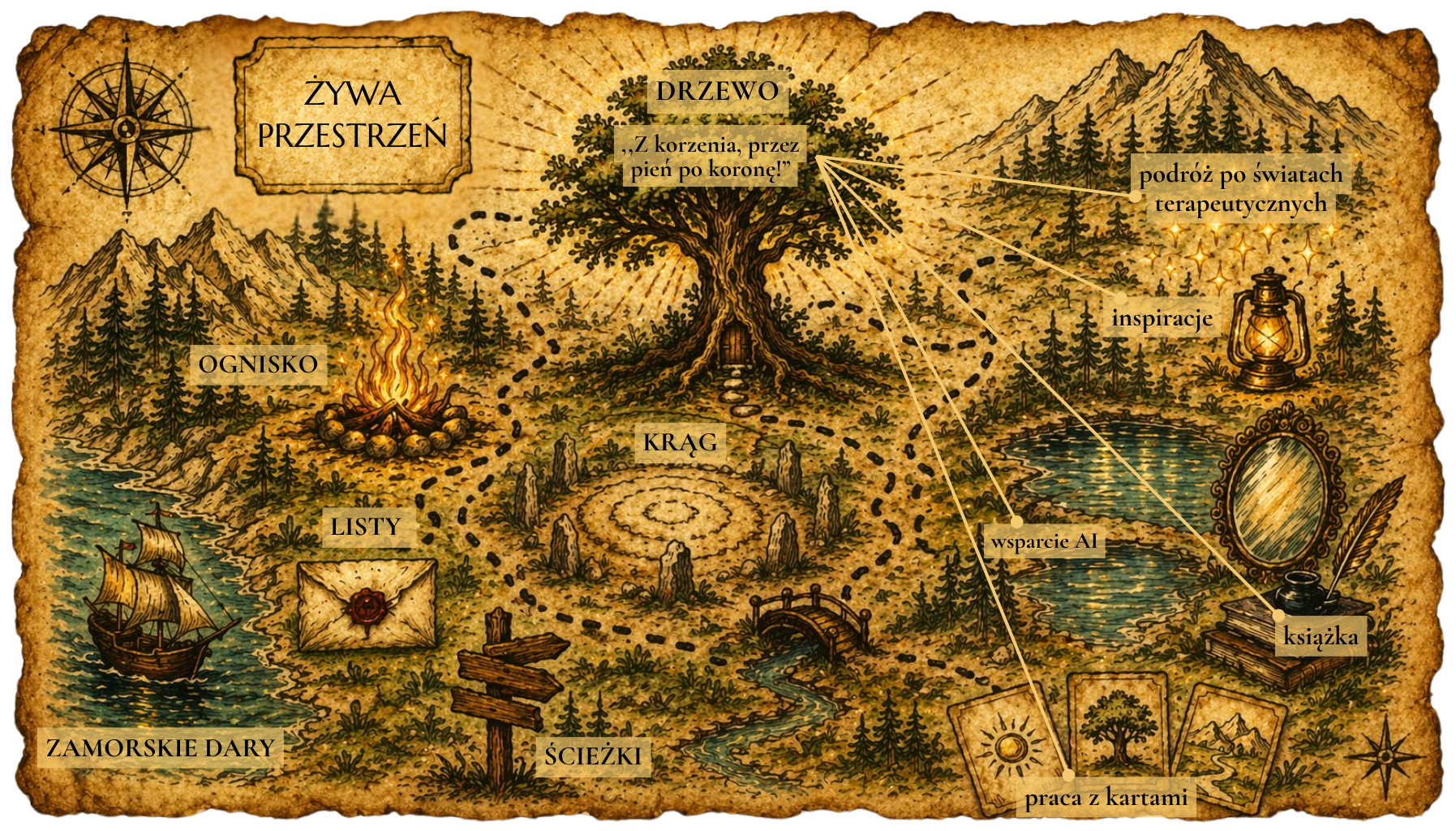 Kurs ,,Żywa Przestrzeń online” osadziłam w baśni, symbolach, klimacie fantasy. Jest to moja próba wyjścia z pośpiechu, presji, współczesnego szaleństwa. Wierzę, że można inaczej – spokojniej. I taką przestrzeń właśnie chciałam dla Ciebie stworzyć. Świetlistą, magiczną, pełną ukrytych znaczeń. Miejsce, w którym można usiąść przy ognisku lub studiować stare księgi. Zależy mi na tym, aby ten kurs nie tylko wartościowy merytorycznie, ale również wspierający dla naszego systemu nerwowego. Zastosowana w kursie forma pracy, narracja oraz tempo mają na celu stworzenie spokojnego, bezpiecznego środowiska do nauki i refleksji.